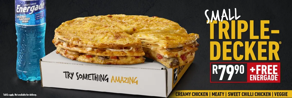 Ts&Cs apply. Offer includes one small (19cm) Triple-Decker® pizza from the following flavour selection only: Meaty; Creamy Chicken; Sweet Chilli Chicken or Veggie, and one free Energade® (500ml) drink available in Blueberry or Naartjie. While stocks last. No substitutes on products offered. Visit debonairspizza.co.za for nutritional information. 3 rd party prices may differ.